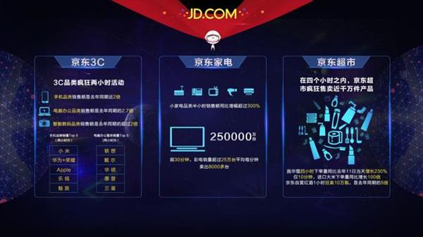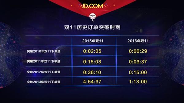 京东数据显示,只用29秒,京东下单量就突破了2010年双十一的全天纪录。随后又用3分37秒、15分钟、1小时13分钟,分别突破2011到2013年双十一全天记录,展现出消费者在京东平台强劲的购买需求。